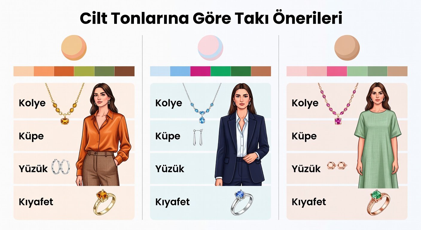 Cilt tonu, takı rengini belirlemede en kritik faktördür. Cilt tonunuzu belirlemek için bileğinizin iç kısmına bakın: Damarlarınız mavi-mor görünüyorsa serin alt tonlu, yeşilimsi ise sıcak alt tonlusunuz. Nötr tonlar her ikisine de uyum sağlar.